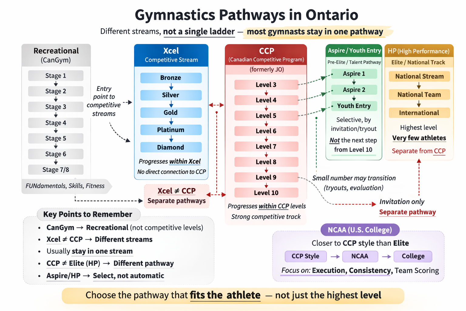 Ontario competitive gymnastics uses several names and tracks — CanGym, Xcel, CCP, Aspire, Youth Entry, HP. They are parallel pathways, not one ladder. This guide explains how they fit together.